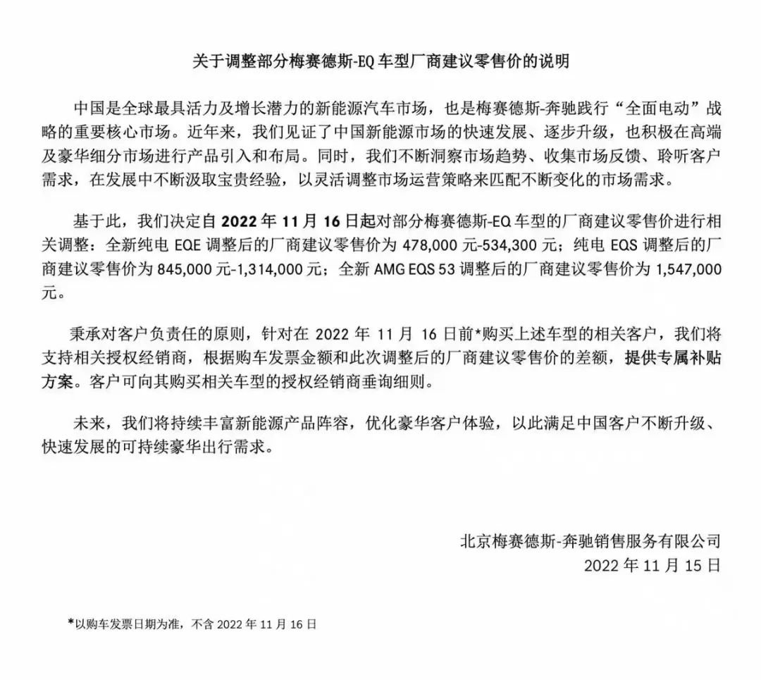 11月15日,梅赛德斯-奔驰官方宣布,自2022年11月16日起对部分梅赛德斯-EQ车型的厂商建议零售价进行调整,涉及车型包含纯电动EQE和EQS。