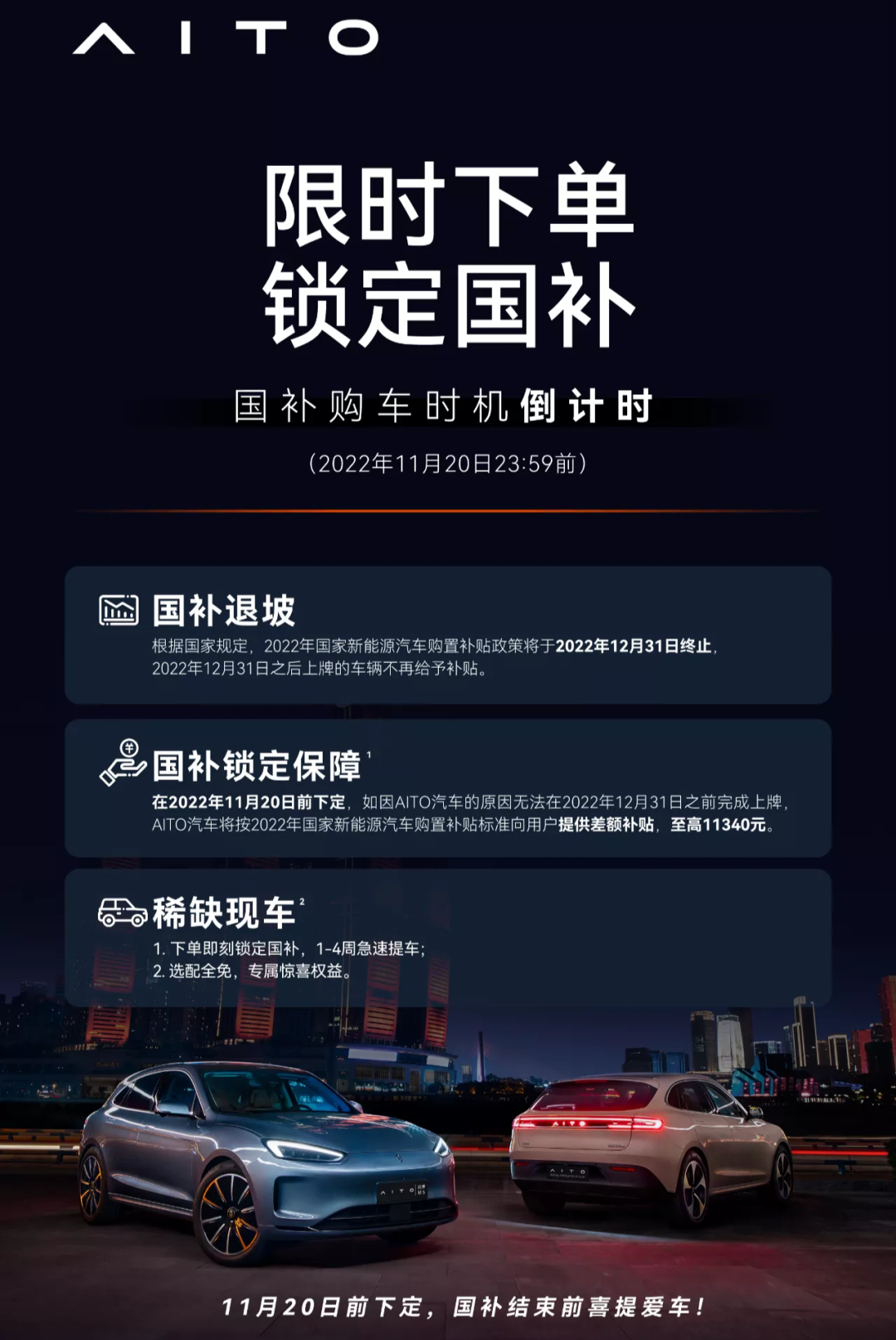 今日,AITO汽车官方发布“限时下单,锁定国补”政策,AITO汽车表示,在2022年11月20日前下定,如因AITO汽车的原因无法在2022年12月31日之前完成上牌,AITO将按2022年国家新能源汽车购置补贴标准向用户提供差额补贴,至高11340元。与此同时,AITO方面还表示称,稀缺现车下单即刻锁定国补,1-4周急速提车,选配全免,专属惊喜权益。