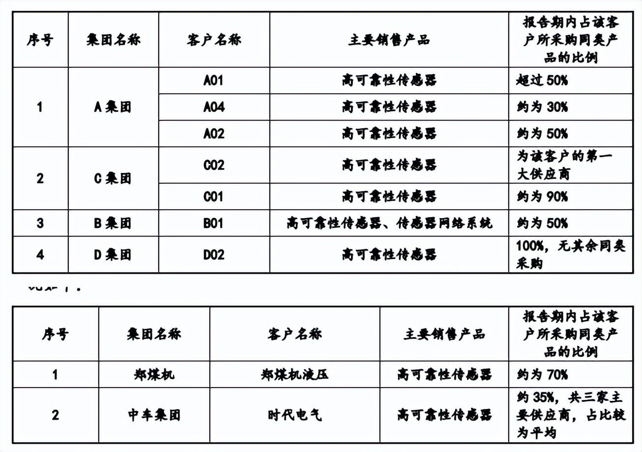 从客户类型来看,公司产品可分为军用传感器和工业传感器两类。其中,军用传感器的终端客户主要为A集团、B集团、C集团、D集团、E集团等军工央企集团下属单位;工业传感器的终端客户主要为中车集团、宝武集团、郑煤机、三一集团、徐工集团等大型工业企业集团。