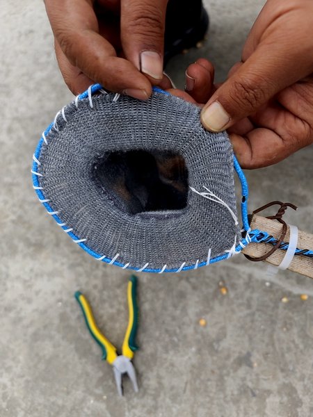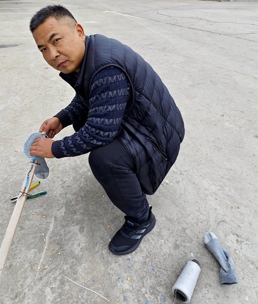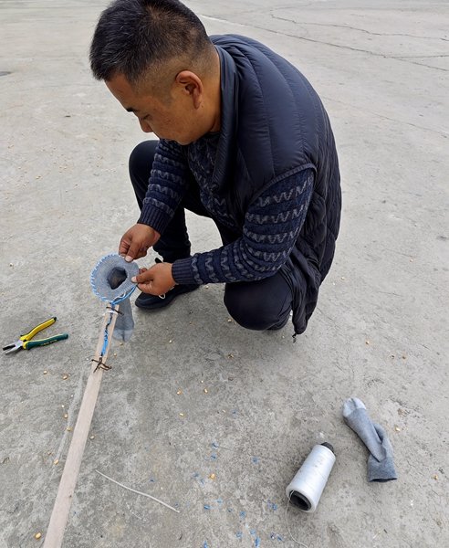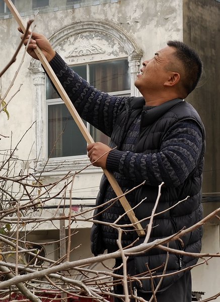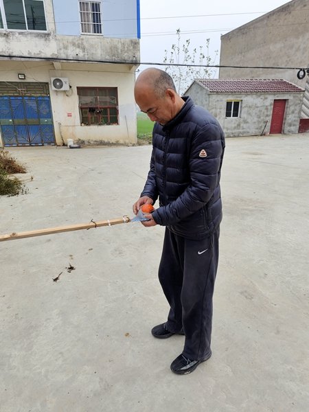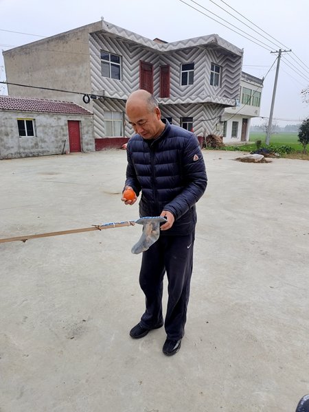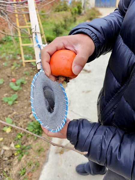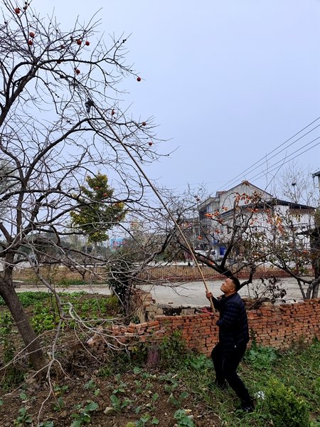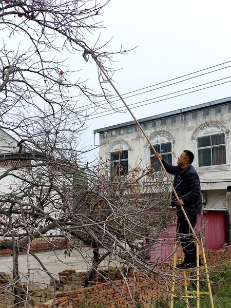经不住柿子的诱惑,在征得小院主人何大嫂同意后,我们决定摘几个柿子,体会一下快乐童年的感受。同事大帅、小沈,找来一根长木条、一个废弃的晾衣架、一只旧袜子,自己动手,制作了一个摘柿子神器。