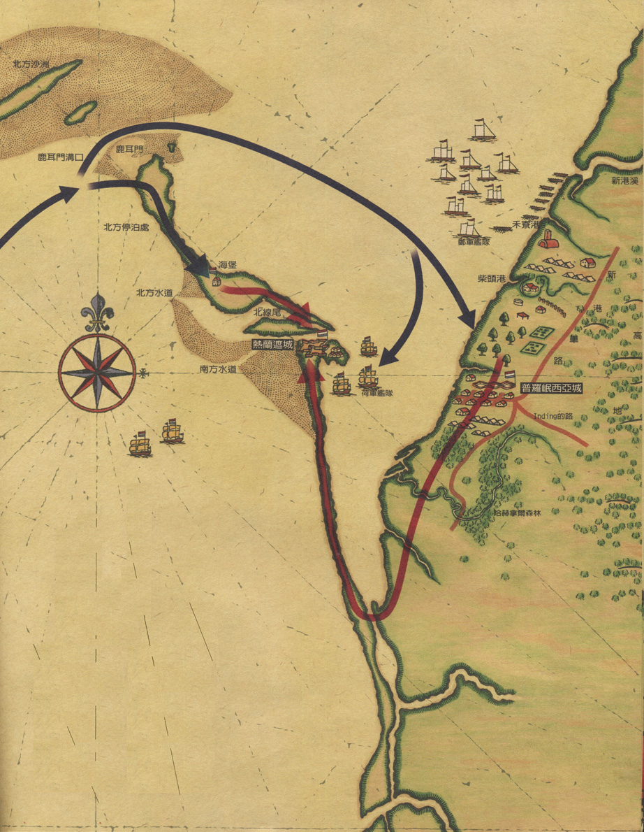 郑成功换小船登上北线尾沙洲查看地形,指挥舰队通过毫无防备的鹿耳门,驶入台江内海,趁着大雾的掩护,主力在禾寮港登陆台湾本岛,直扑普罗民遮城(即赤嵌城),另一路则登陆北线尾沙洲,向南进发,准备控制大员港的主水道。
