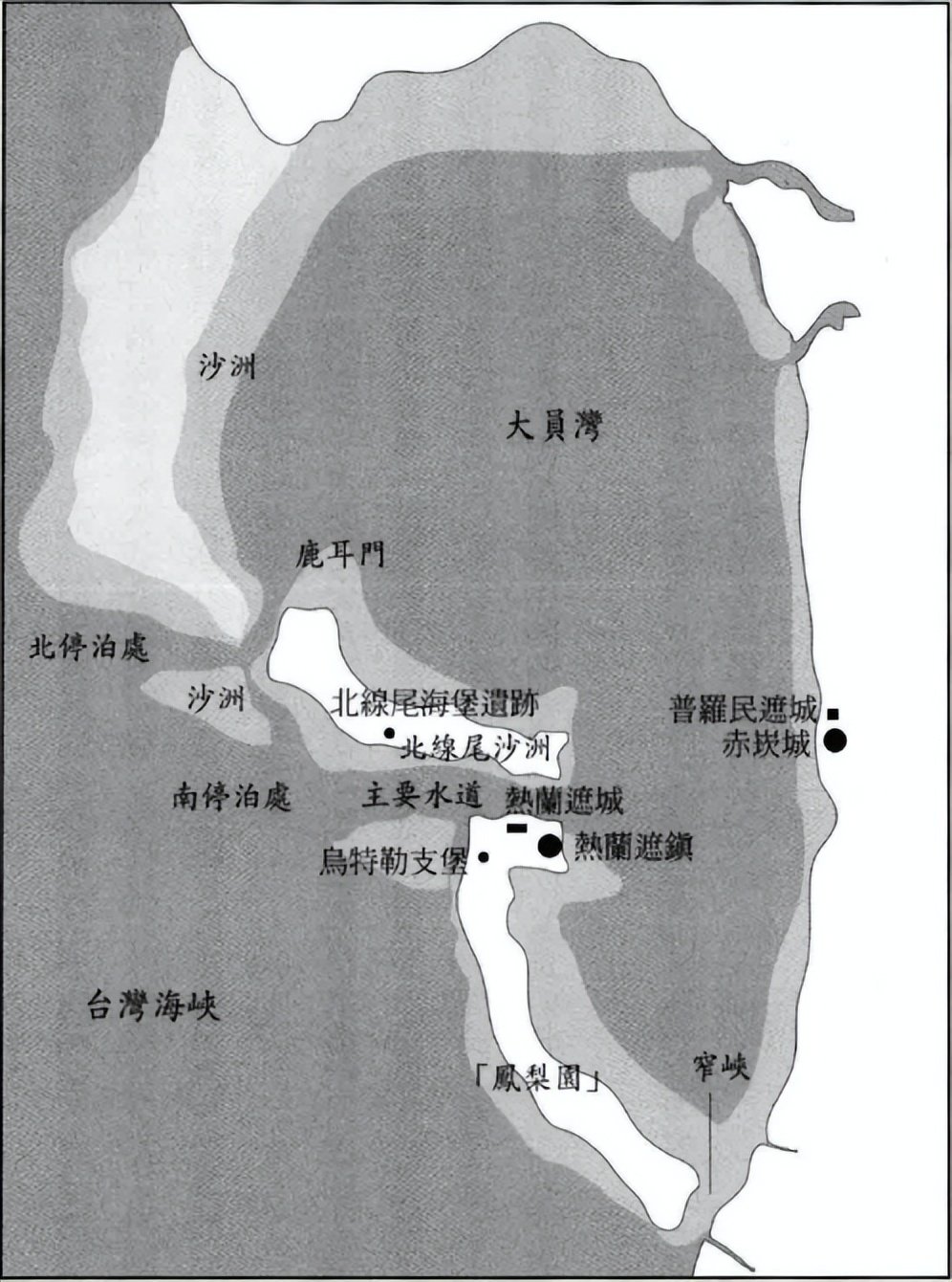 ▲大员是数条河流入海口处沙洲上形成的,大员湾又称台江内海,热兰遮城所在沙洲被称为鲲身