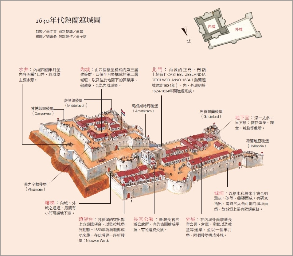 荷军最大的依靠就是热兰遮城,此城周长200多丈,高3丈多,分内外两城,还有地下室,内城有4座棱堡,外城则有三座棱堡,城墙高三丈由泥土夯筑而成,外面再包覆一层红砖,最外面包覆的是用混合沙石、碎贝壳、糖汁、糯米汁的砂浆砌筑的花岗岩。堡垒坐落于较高的沙丘上,总共布置有70余门大小火炮,是一座典型的文艺复兴式星形要塞。