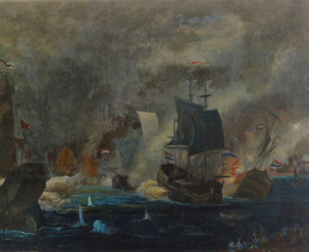 随后大举出动,冲入台江内海,计划以科克尔克号、安克文号、罗南号、泰伯德号、科登霍夫号为首的主力战舰绕到郑军在热兰遮镇的炮垒背后,依次下锚炮击围城的郑军,其他12艘小型船只则攻击郑军的水师。