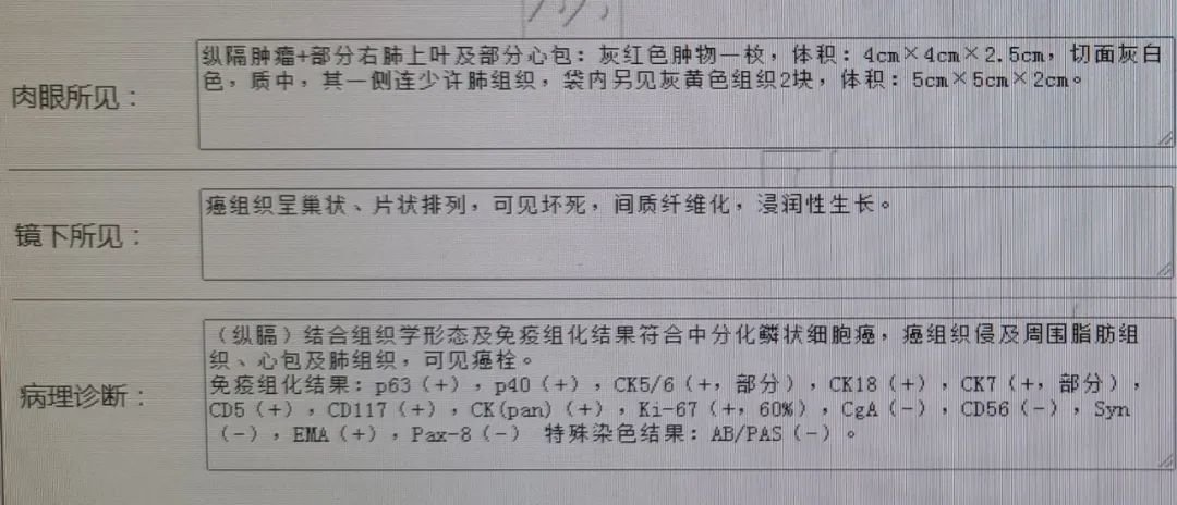 手术由杨锋主刀,术中探查见胸腺病变包块位于前上纵隔胸腺区心包表面,侵犯部分心包,局部与右肺上叶粘连,于是将胸腺和纵隔脂肪组织与膈神经分开,切除部分右肺上叶后,切除肿瘤侵犯部分心包,完整切除胸腺及其周围脂肪组织。