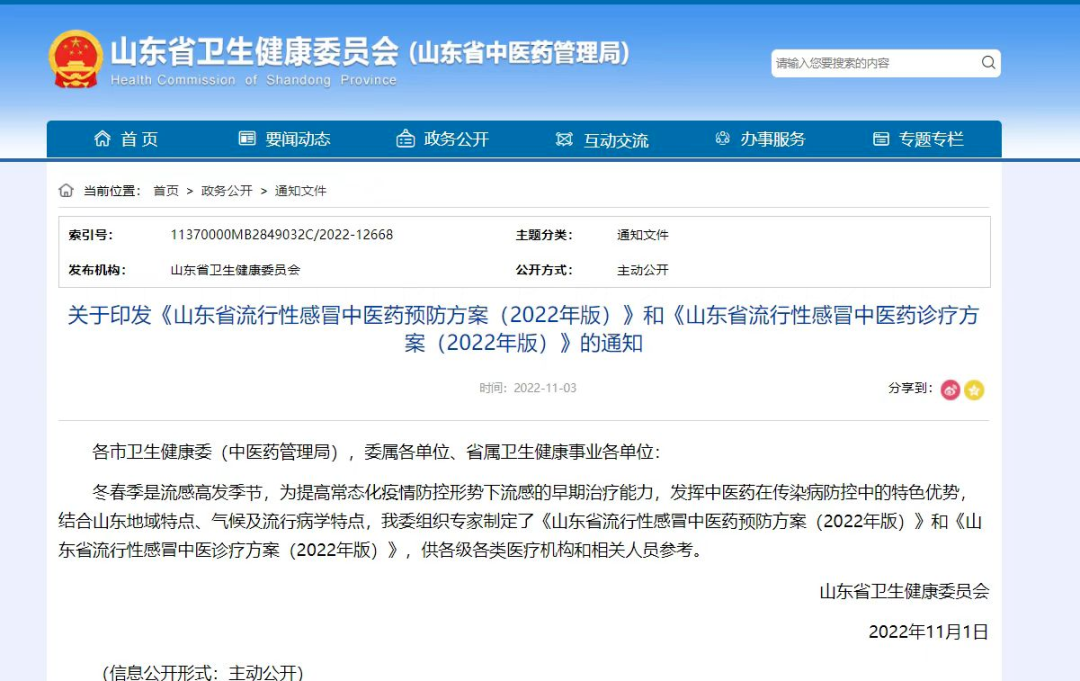 山东省卫健委11月份印发《山东省流行性感冒中医药预防方案(2022年版)》和《山东省流行性感冒中医药诊疗方案(2022年版)》,诊疗方案指出,为提高常态化疫情防控形势下流感的早期治疗能力,发挥中医药在传染病防控中的特色优势,特制定了该方案。