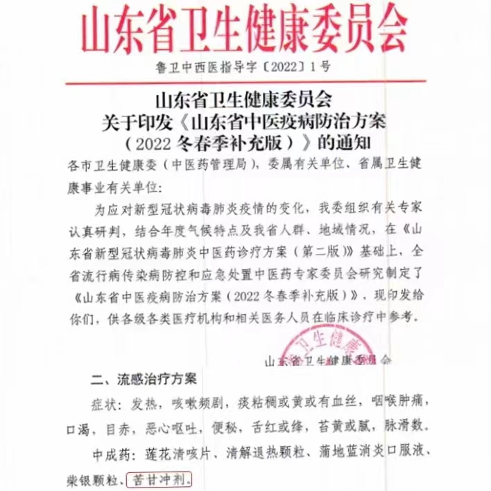 2022年,山东省卫健委在《山东省中医疫病防治方案》中将苦甘颗粒列为流感治疗推荐中成药。
