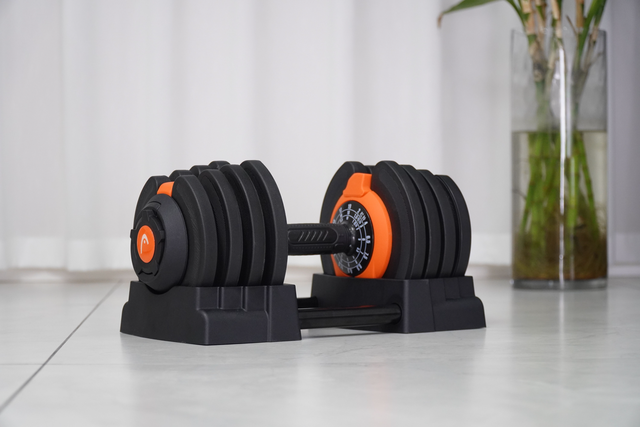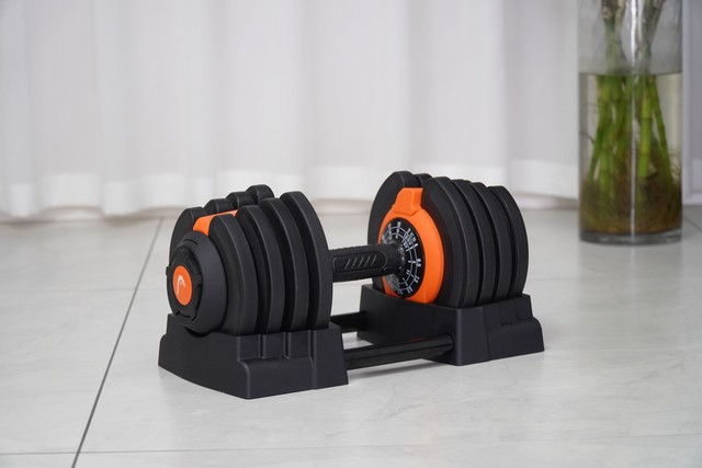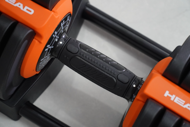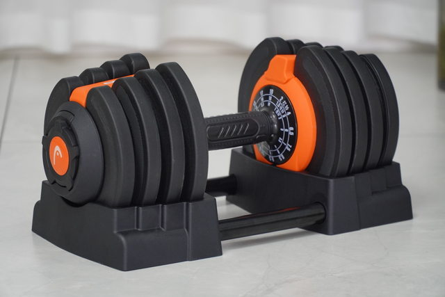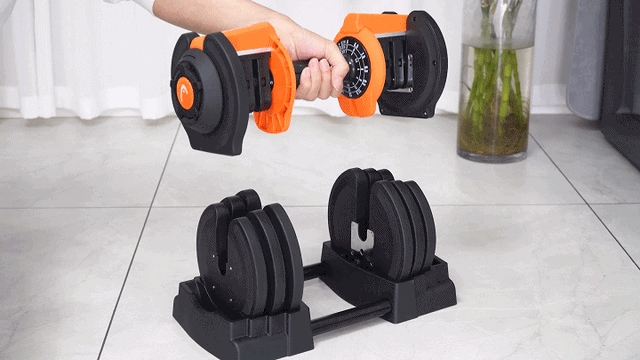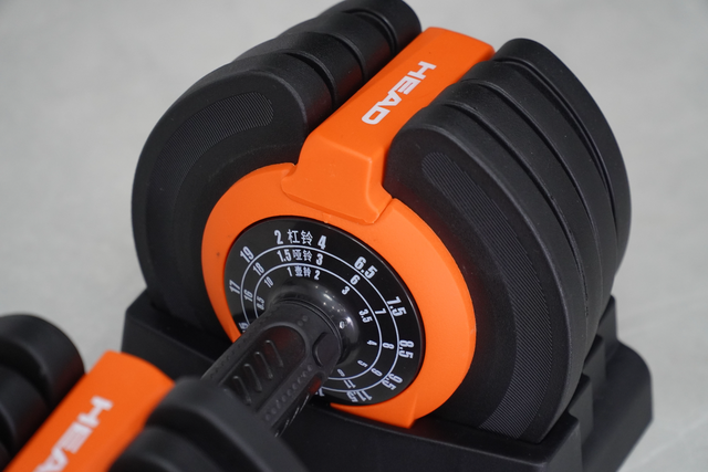 而海德的这款可调式哑铃就简单多了,只要拧动握把到想要的刻度上,机械结构就会对铃片进行选择,随时调整自己使用的重量,感觉重了就顺时针拧一下,铃片数量减少,重量减轻;感觉轻了就逆时针拧一下,铃片数量增多,重量增加,整个过程要不了三秒钟,非常方便快捷。