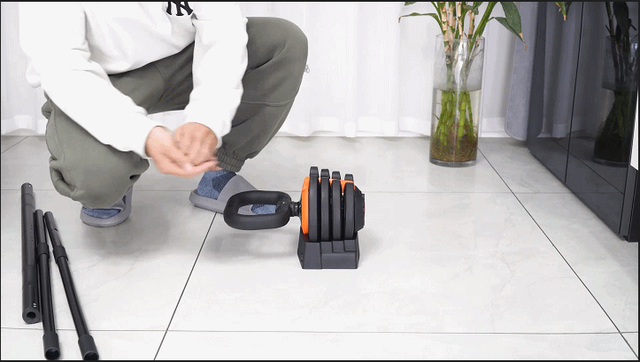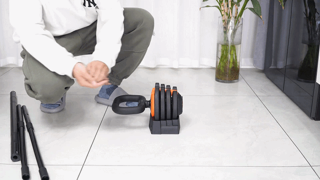 海德飓风/热砂三合一哑铃共有三部分组成,分别是握把、铃片组、底座。其中握把部分采用机械方式和铃片组连接,共同放置在底座上。当需要使用时,我们可以根据尺寸表上的数字拧动握把,铃片组中的机械结构就会发生作用,有选择性的咬定铃片,让特定重量的铃片跟随铃片组离开底座,参与到锻炼中来,而剩余的铃片则会继续留在底座上。