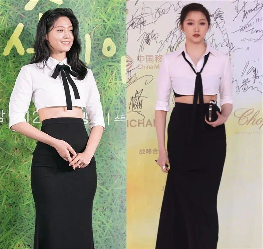 赵露思意外挺适合韩式妆容的,可能和她平日行为举止就有些韩里韩气有关,只是有时候光找对了妆容还不够,整体造型搭配才是最重要的,只看一颗头,赵露思不输张元英,可一旦上了全身照就瞬间尴尬了,身高一米六和身高一米七的身材比例,放在一起看差距实在有些太明显了!