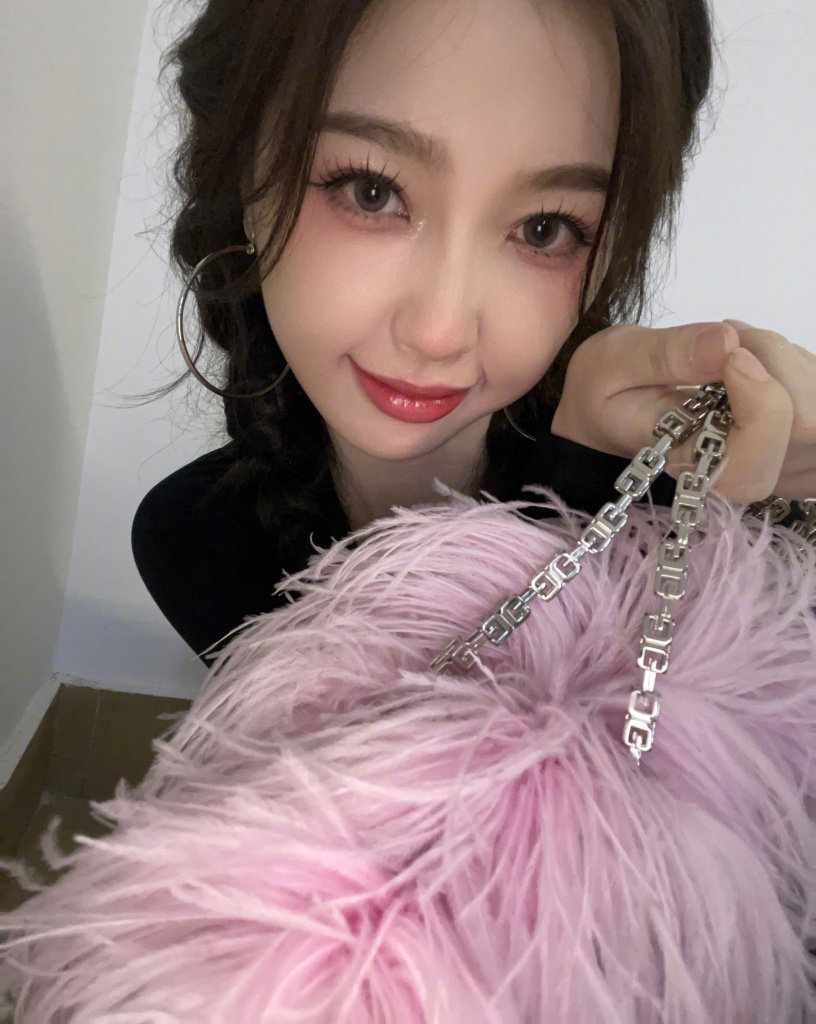 2022年11月17日,虞书欣发布一组粉色羽毛手拎包造型随拍。