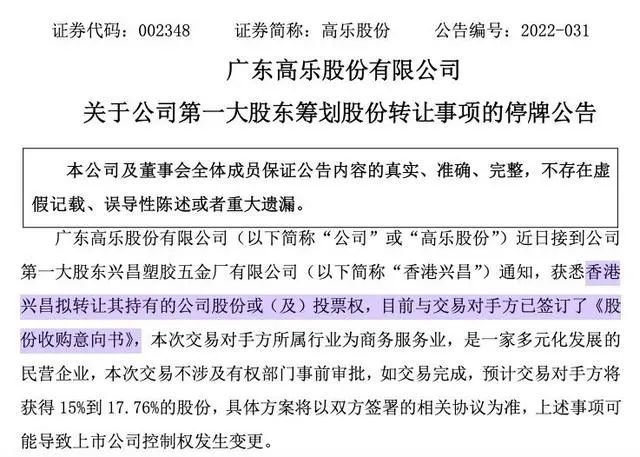 11月17日晚间,高乐股份披露,公司第一大股东兴昌塑胶五金厂有限公司(以下简称“香港兴昌”)拟转让其持有的公司股份或(及)投票权。如交易完成,预计交易对手方将获得15%到17.76%的股份,此举可能导致公司控制权变更。