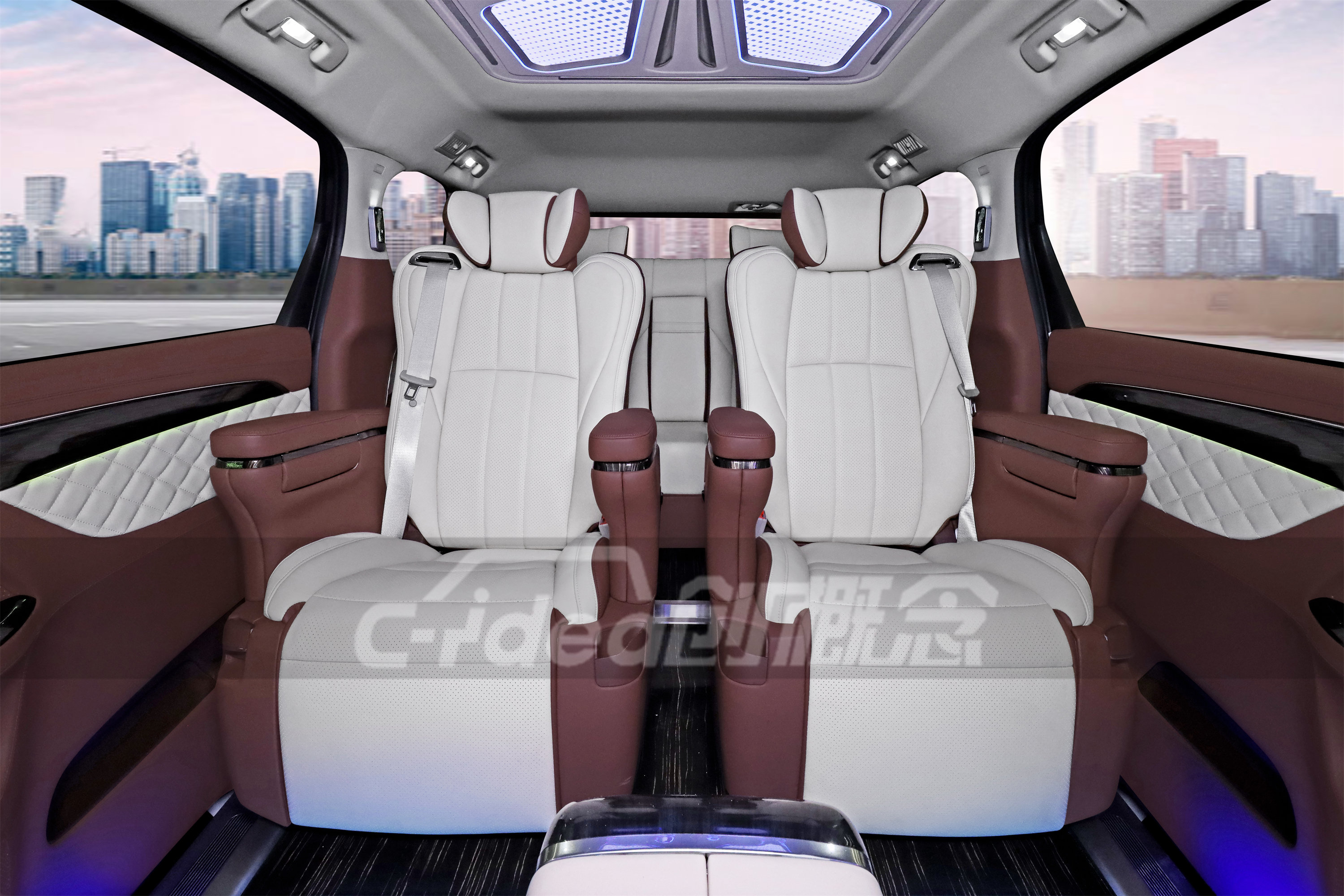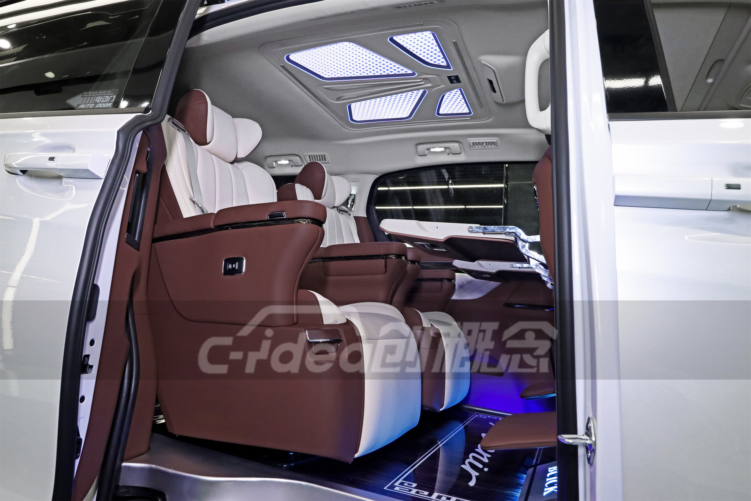 中排安装埃尔法航空座椅,并带有加热,通风和按摩,腿托等调节功能,还可以 360°旋转,前后移动调节,这才是作为商务车必备的多功能调节座椅。后排座椅也是更换成了分体式的航空座椅,能三座变两座,多功能扶手盒自带杯托设计,储物方便, 180度躺平变成一张沙发床,长途旅行中累了可以在上面短暂的休息,十分惬意。