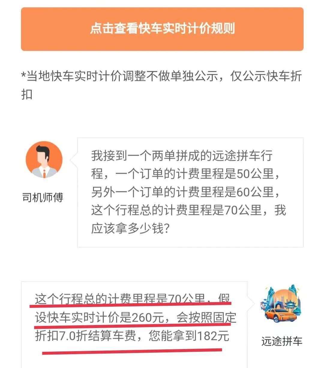 假设快车70公里总价是260元, 则按照快车固定价格7折计算=182元