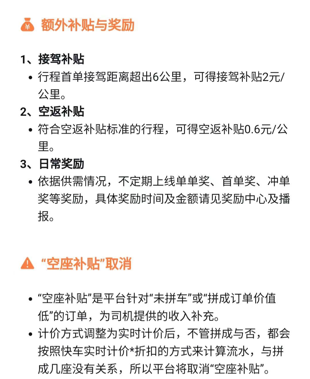 另外,同样值得注意的是,滴滴还针对远途拼车单推出了接驾补贴、空返补贴、 日常奖励等鼓励司机接远途拼车订单。