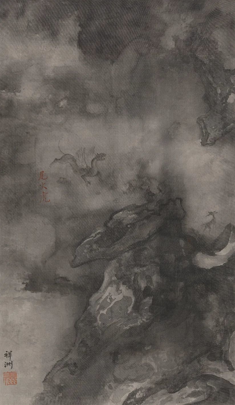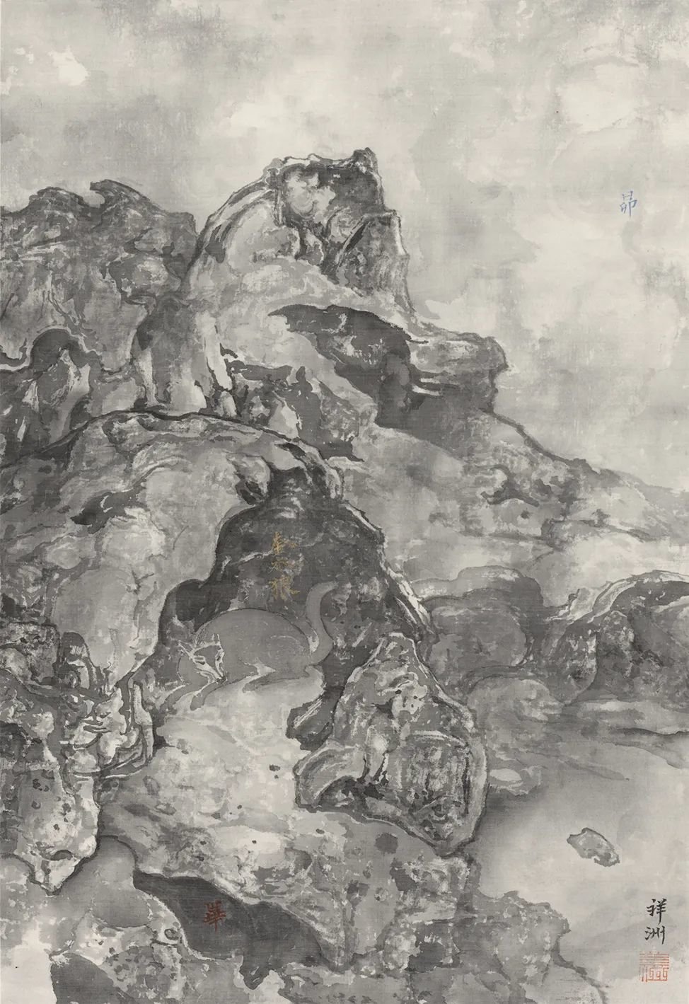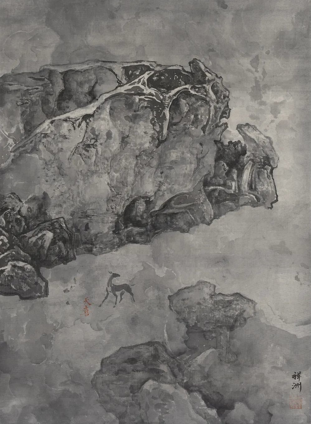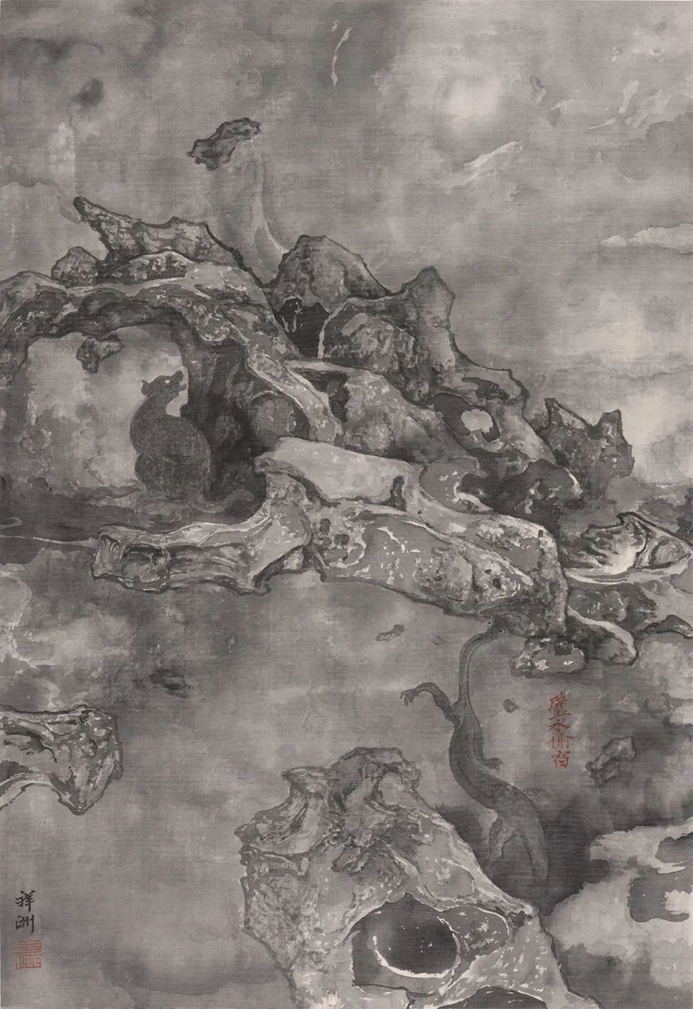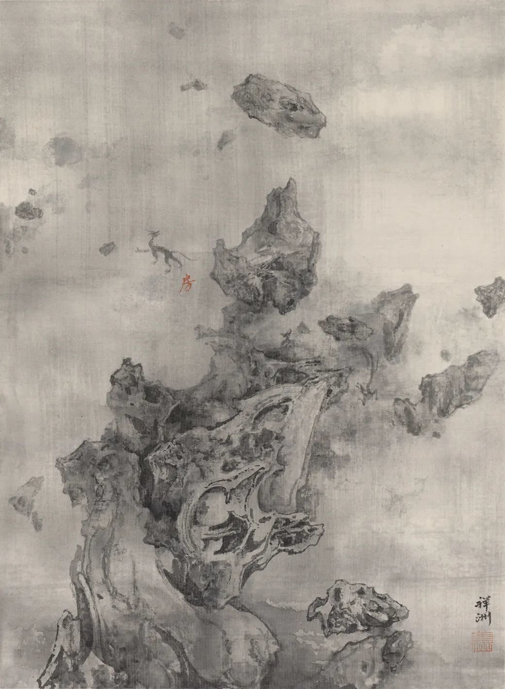 “天象”是泰祥洲个人风格形成的代表系列之一,他在山水中引入星辰宇宙、天壤陨石,将古代先贤对于彼岸世界的想象拓展至太空。“全天星图”由“天象”延伸而成,这一全新系列首次成系统地在个展中亮相。《房日兔》、《尾火虎》、《箕水豹》……这些中国古代天文学家观测日月运行而划分的二十八星宿,被赋予神仙的形象隐现于怪石飘空的宇宙空间。在亦真亦幻之间,连接起古今时空、此地与彼岸。