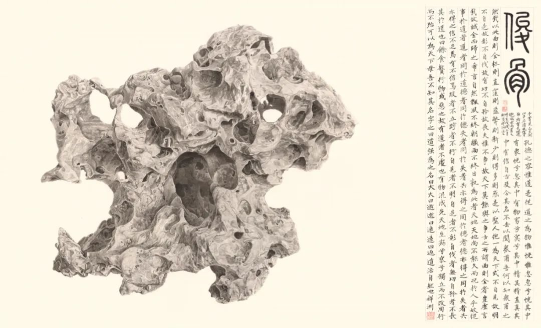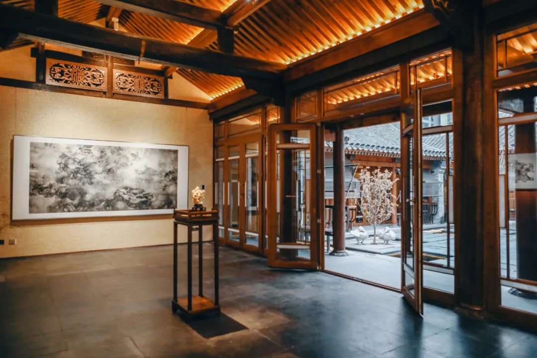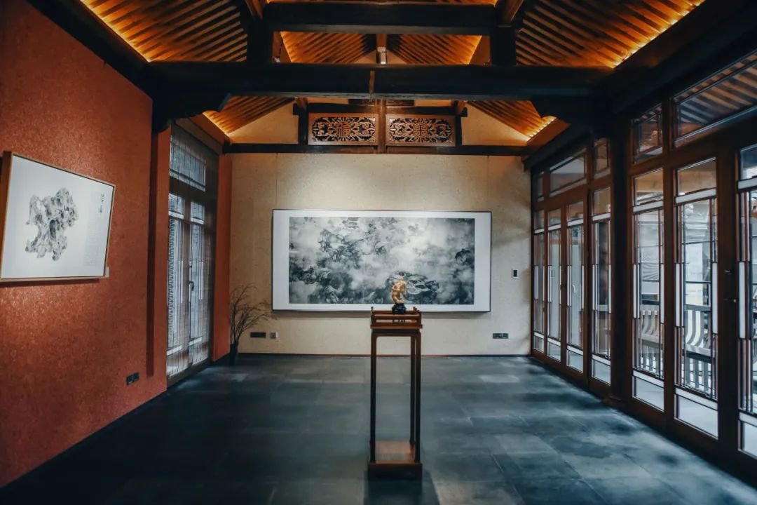 展览空间的安排,也与作品一同构建着既回归古老精神又超越当下现实的理想。“文人赏石”绘画《俊骨》与槐轩四合院落中陈列的赏石相互呼应,移步换景之间产生时空交错的意味,把观者引向思考人生与宇宙的多重奥义。