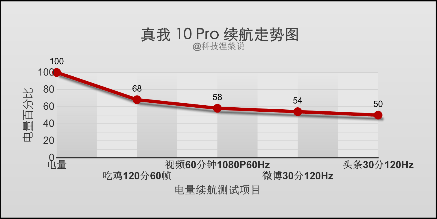 真我10 Pro搭载了一块5000mAh的超大电池,这个组合还是熟悉的味道,续航肯定是没啥问题的,实际续航测试中,两小时吃鸡耗电32%,一小时1080P视频耗电10%,一小时微博头条资讯耗电4%,最终剩余电量50%。