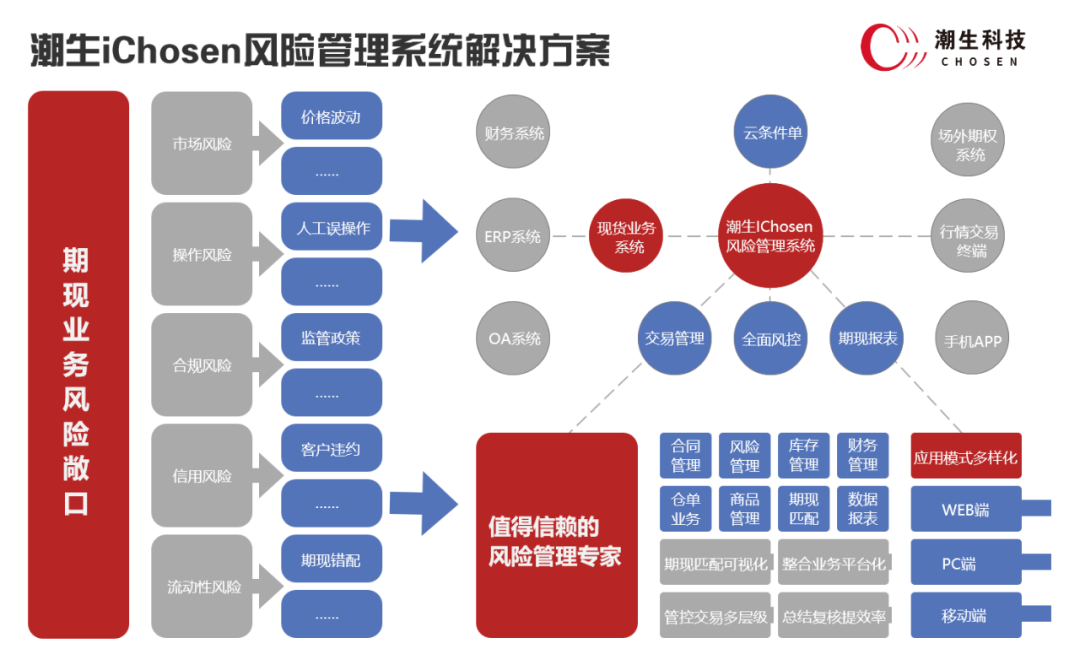 在千变万化的市场中,潮生iChosen风险管理系统作为客户身边最值得信赖的风险管理专家,始终伴随产业客户身边,聆听客户需求,用专业的风险管理定制化方案和高效周到的服务帮助客户解决问题、满足客户多样化需求。