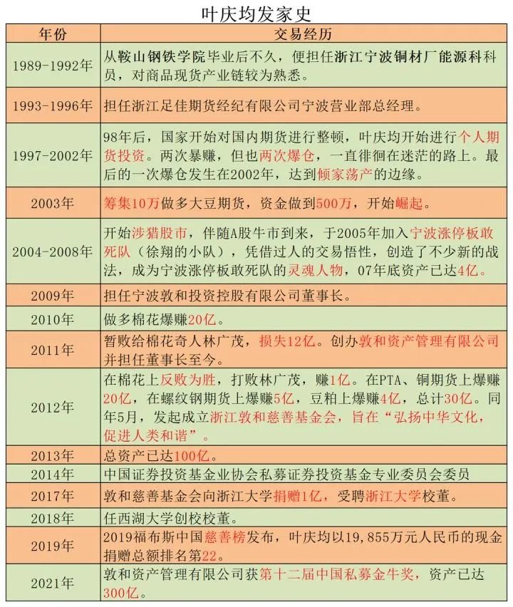 叶庆均,90年代三次沉浮,02年爆仓,03年抵押房产10万,崛起于大豆牛市,是宁波涨停板敢死队之灵魂。麾下有一位残疾军师,和张唐等五虎猛将。成名于2010年棉花牛市,爆赚数十亿。2011年暂败给野人,损失12亿,今年进行反扑,成功复仇。同时,今年在TA、铜上赚20亿,螺纹5亿,在豆粕牛市中已赚4亿。安信证券首席经济学家高善文称之“洞察深邃,胆识过人”。目前资产已达百亿。