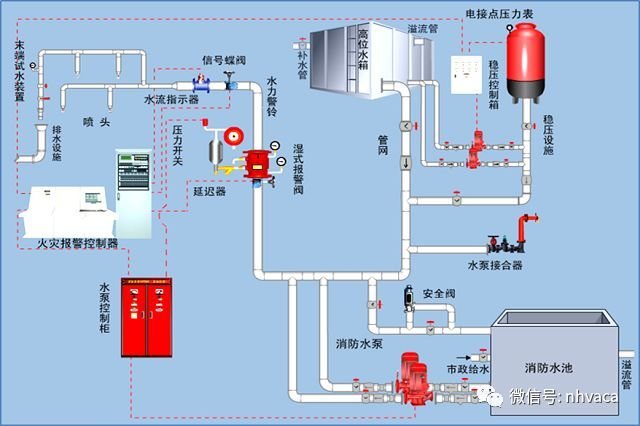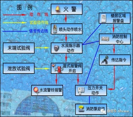 当保护区内发生火灾,环境温度持续上升,当温度达到闭式喷头动作温度时,喷头动作,洒水灭火,使管网一侧(系统侧)水压下降,实施报警阀阀瓣因上下压差而开启,向系统供水灭火。安装在区域干管的水流指示器发来的电信号后发出声、光报警,显示失火区域。同时由于湿式报警阀的开启,使一部分水流入报警管路,通过延时器延时5-90s后,水力警铃发出持续的报警铃声,压力开关同时动作,向消防控制中心发出电信号(也可直接向消防泵控制箱发出电信号)启动消防泵。
