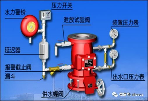 报警阀组:湿式报警阀结构是一种单向阀,它只允许水单方向流入喷水系统并在规定流量下报警的。它在系统中的作用:接通或关断报警水流;喷头动作后报警水流将驱动水力警铃和压力开关报警;防止水倒流。