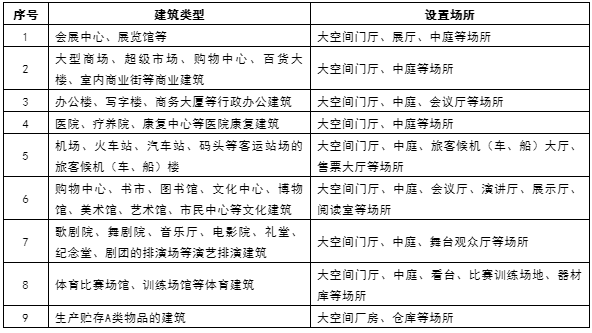 空间高度较高,采用自动喷水灭火系统难以有效探测、扑灭及控制火灾的大空间场所。如大剧院、体育馆、会展中心、购物中心、大型仓库、科技馆、博物馆、图书馆、美术馆、艺术馆和候机楼厅等大空间环境。