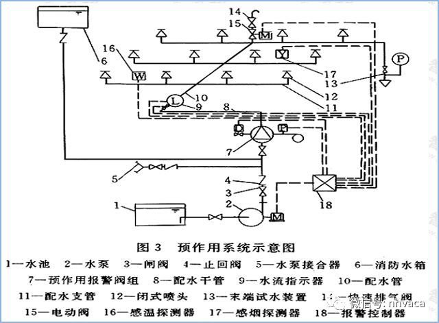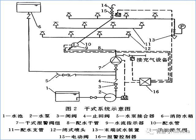 为喷头常闭的灭火系统,和火灾自动报警系统配套使用,报警阀后的管网中平时不充水,准工作状态时,管网中通常充有压缩空气(用以监测管网泄漏情况)。当火灾发生火灾时,火灾探测器报警后,通过报警联动控制器自动联动控制系统电磁阀门排气、充水,由干式变为湿式系统。只有当闭式喷头的热敏元件受热达到或超过额定动作温度时,热敏元件动作(熔化、破碎),闭式喷头开启,喷水灭火。