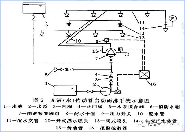 采用闭式喷头的灭火系统;准工作状态下管网中充满用于启动系统的有压水;当喷头保护范围内发生火灾,喷头热敏元件受热达到或超过公称动作温度时,热敏元件动作(熔化、破碎),从而喷头开启,出水灭火,同时系统自动启动。