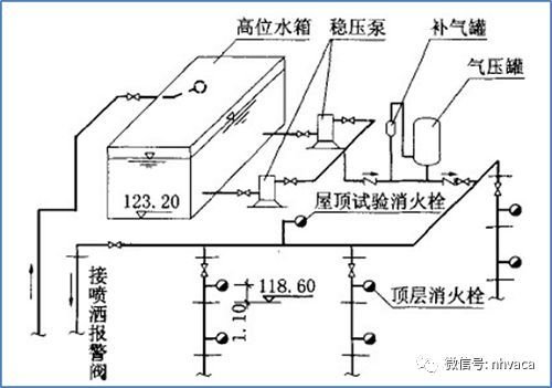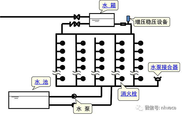 消火栓给水系统:由消防给水管道、消防水池、高位水箱、水泵、增压稳压设备、消火栓、水泵接合器等组成。