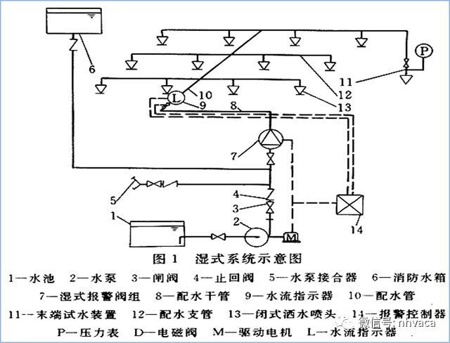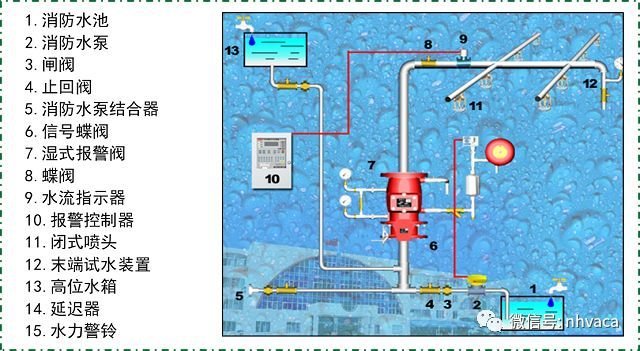 湿式系统由闭式洒水喷头、湿式报警阀组、水流报警装置、控制阀门、末端试水装置以及管道和供水设施等组成,管道内充满用于启动系统有压水的闭式系统。