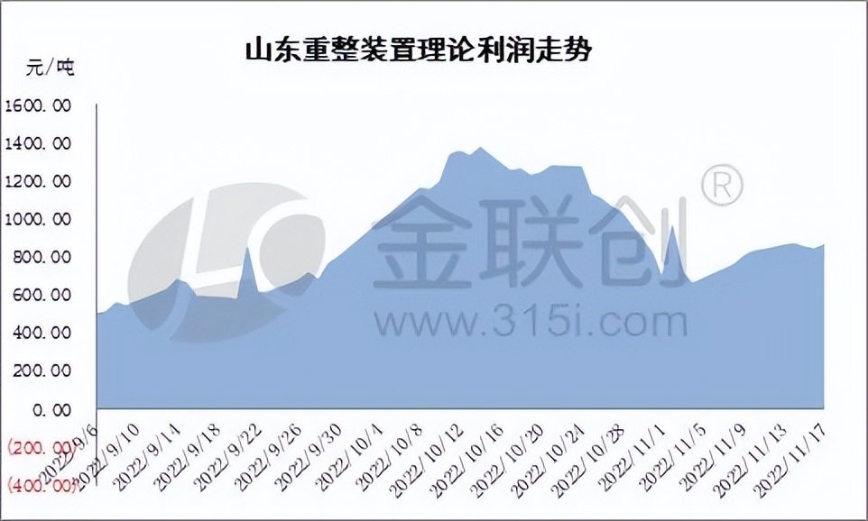 重整装置利润来看,截止11月17日四季度均值在1032.88元/吨,相较于2021年同期上涨266.48%。其中最高值出现在10月12日,这段时间因十一假期过后,混合芳烃市场价格大幅走高,原料石脑油价格呈现下行走势,故重整装置利润高位。随后混合芳烃价格震荡下行,重整装置利润开启下行通道。