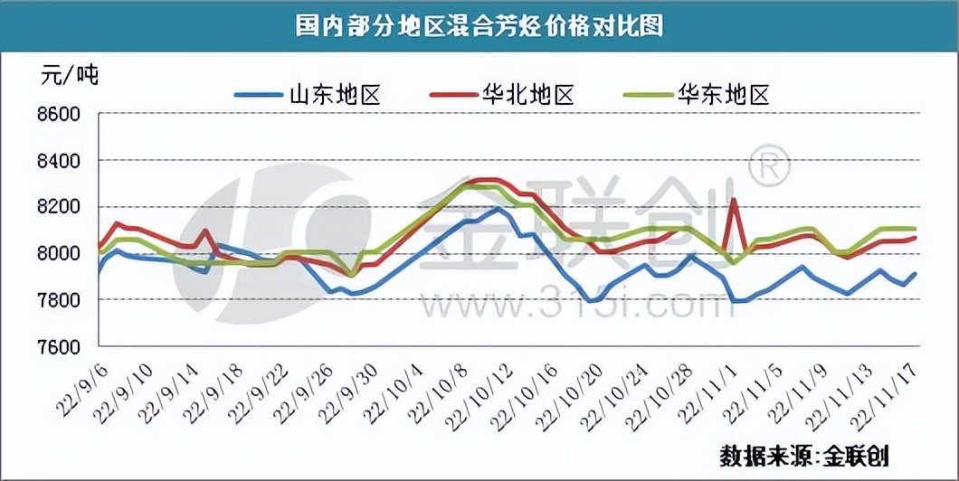 截止2022年11月17日,四季度混合芳烃市场价格走势震荡,整体呈下行走势。10月受假日提振,市场购销气氛活跃。过后受新冠肺炎疫情影响,市场需求疲软,行情趋弱震荡。