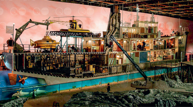 贝拉方特号布景。导演希望能在船体横截面创造一个巨大的玩偶之家,让他可以在房间之间移动升降镜头,以“名人堂”的方式来展现泽索在船内的动态,如休息室、桑拿房、实验室、厨房、图书馆、更衣室、机舱和观察室。
