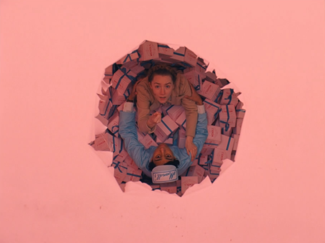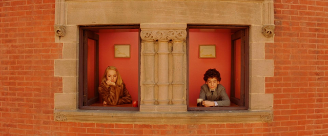 为了使最重要的元素正好位于中间,画面基本上都会提前设定好,相机与拍摄对象呈 90 度角。影片的画面中心会画一条水平线,每一侧会是彼此的镜像。电影人员倾向避免这种形式主义,因为它会给人一种舞台感(确实如此)。这也使得剪辑痕迹更加明显。但这种对称却有一种舒适感。它呈现出了一种对电影世界的控制,这也能让安德森把我们的注意力引向重要的事情上。