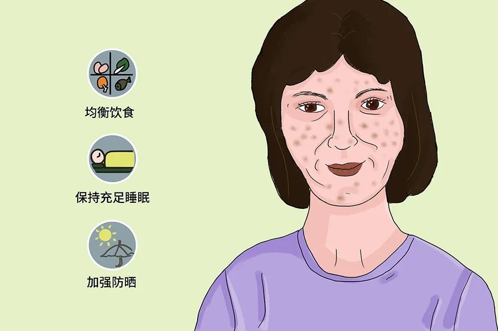 2、养成良好的生活习惯,戒掉不良习惯,如抽烟、喝酒、熬夜等,可以在一定程度上减少黄褐斑的产生。