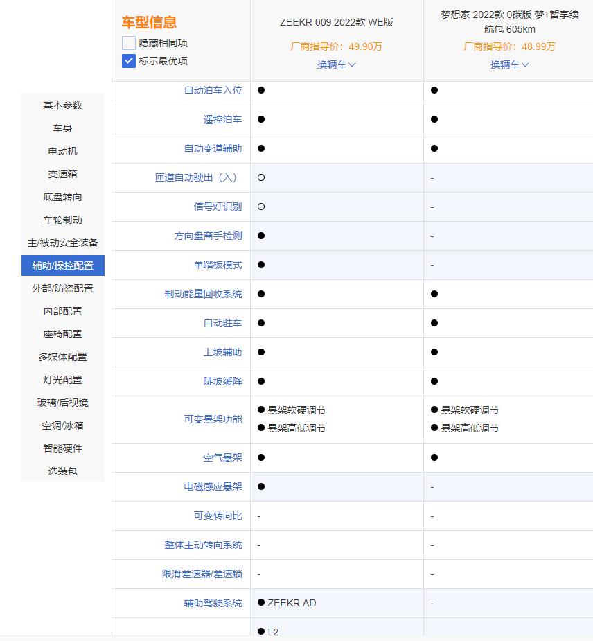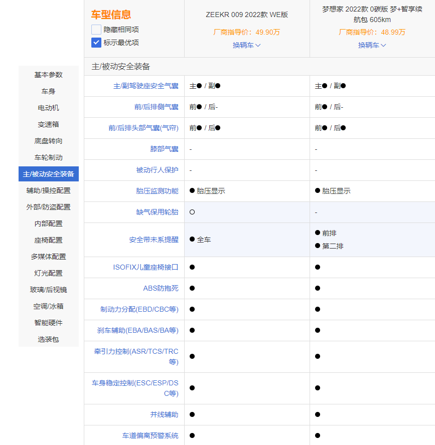 在配置方面,我们选取了两车价格差别最小的岚图梦想家 2022款 0碳版 梦+智享续航包 605km(指导价:48.99万)和极氪009 2022款 WE版(指导价:49.9万)进行对比,看看谁的配置更为丰富。