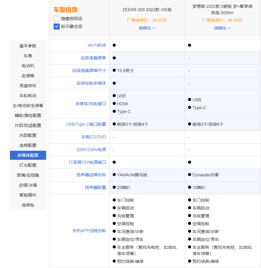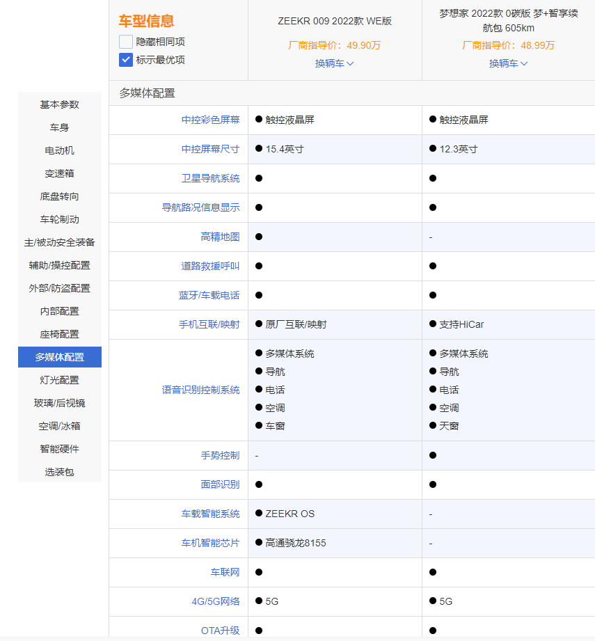 在多媒体配置方面,岚图梦想家独有百度地图、手势控制等,极氪009独有后排控制多媒体等。
