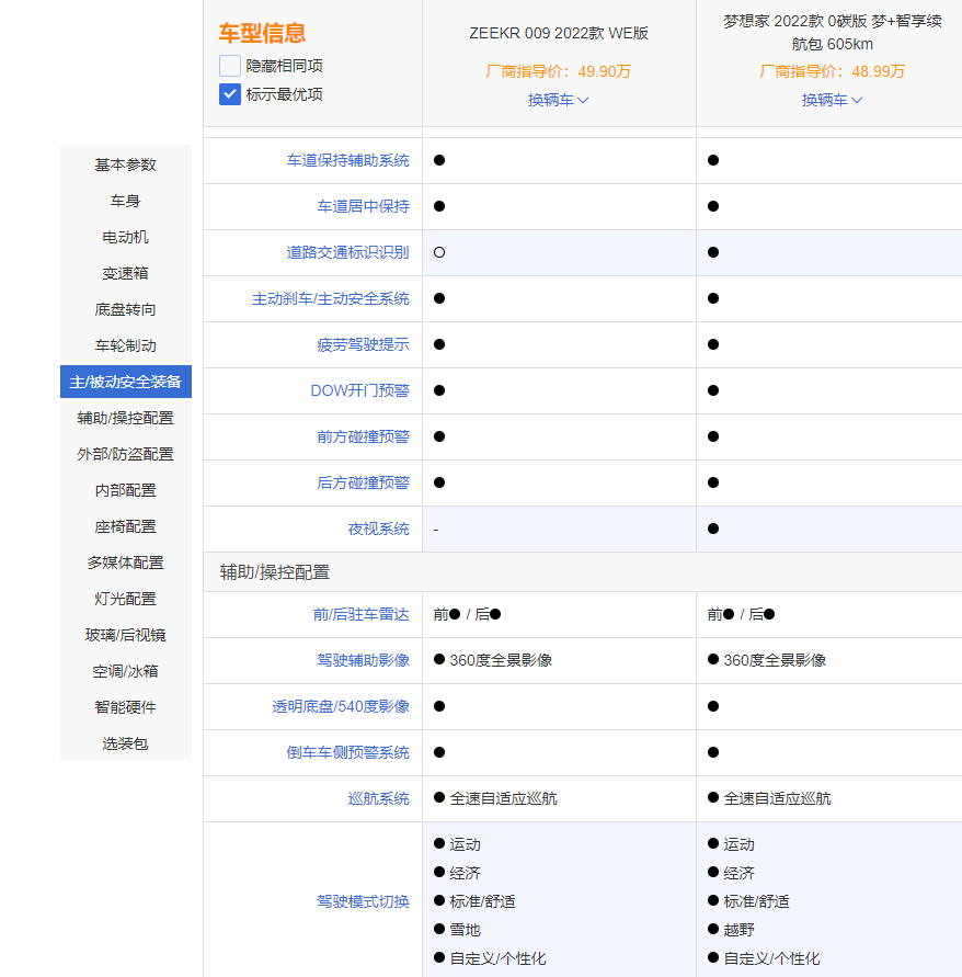 在主被动安全配置方面,岚图梦想家独有道路交通标识识别和夜视系统,极氪009独有全车安全带未系提示功能。