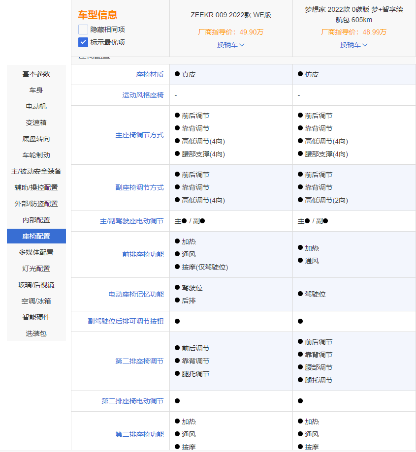在配置方面,极氪009的总体优势较大,特别是座椅配置方面,更能保证舒适性。