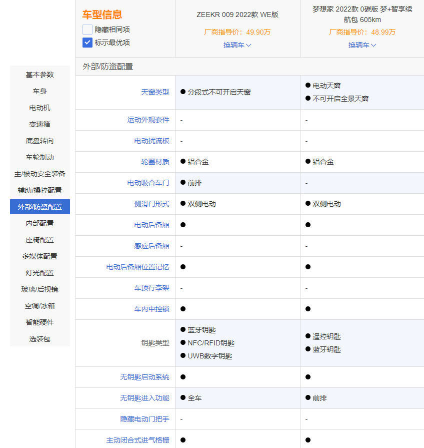 在外部/防盗配置方面,极氪009独有前排电吸门、数字钥匙、全车无钥匙进入和对外放电功能,岚图梦想家独有全景天窗和哨兵模式。