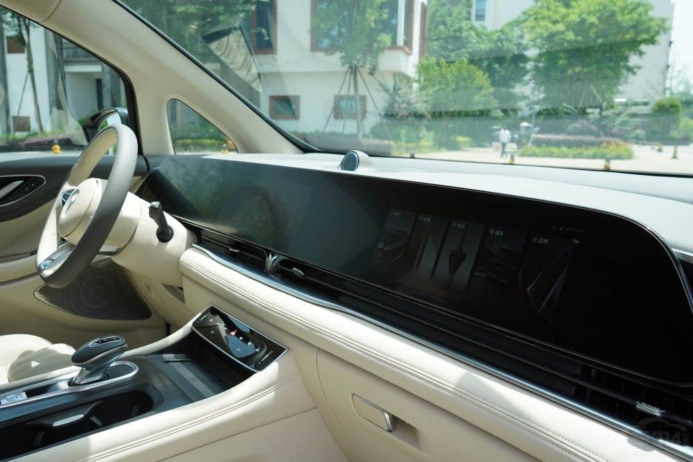 岚图梦想家的内饰造型同样十分简洁,中控的面板内覆盖有三款大尺寸液晶屏,从左至右分别是尺寸同为12.3英寸的液晶仪表盘、中控大屏和副驾驶娱乐屏。