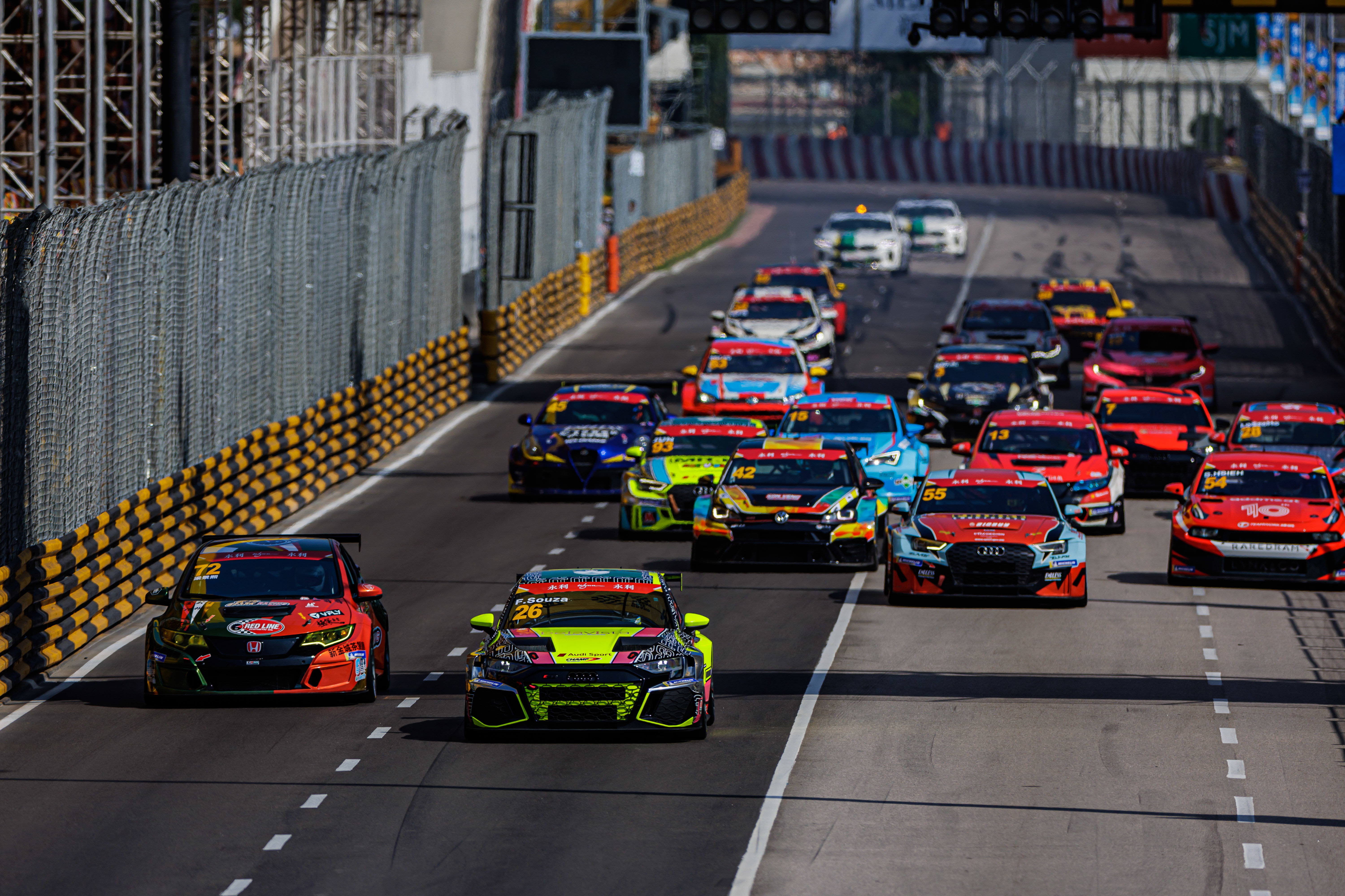 澳门本土车手苏沙(Filipe de Souza)为四环品牌在这条全场6.2公里极具挑战的东望洋街道赛道上的胜绩再添一笔。他驾驶 Champ Motorsport 车队的奥迪 RS 3 LMS 赛车,自杆位发车领跑全场,奉献了一场堪称完美的比赛。他的队友黄俊豪则遗憾错失领奖台席位,收获第四名。