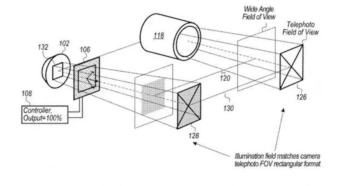 实际上,苹果申请一项更为激进的闪光灯专利,通过马达控制内部透镜移动,改变光线的发散角度,从而实现不同效果的打光。但,这项方案最终未能落地,或许是闪光灯模组体积限制。