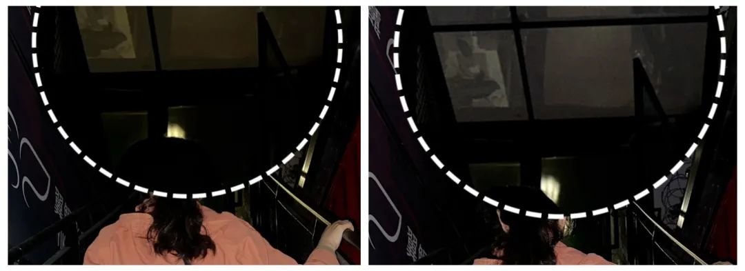 实际上,iPhone 13 Pro 闪光灯无法打到的远处,是靠后期算法拉起来的,iPhone 相机会根据画面实际情况进行处理。将照片放大后画质差异可见,iPhone 14 Pro 远处因为有光的照射细节更清晰,并且涂抹算法没有过多介入,噪点明显。