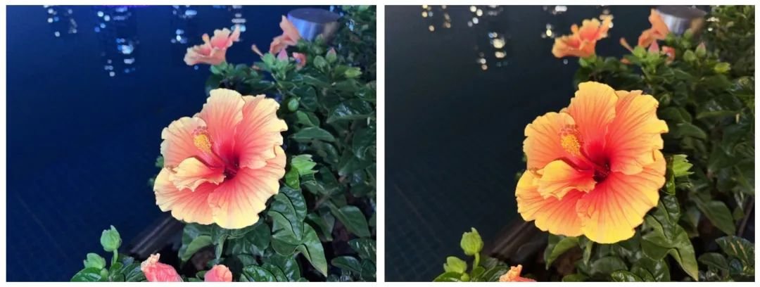 例如同一环境近距离拍摄湖边的花朵,iPhone 13 Pro 开启闪光灯后画面出现了明显偏冷,湖水的浅绿直接拍成深蓝,红黄相融的花朵也像褪了色似的,整体画面泛白。而 iPhone 14 Pro 的画面则真实许多,尤其是花朵的色彩与肉眼几乎一致。