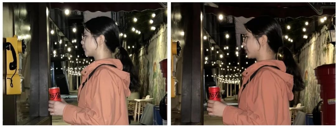 切换到主摄,样张的情况与超广角接近,iPhone 14 Pro 人物面部打光更好,肤色有红润感,同时背景的黄灯没有被算法干扰,不至于强拉饱和度,让人物稍稍脱离背景以达到突出效果。