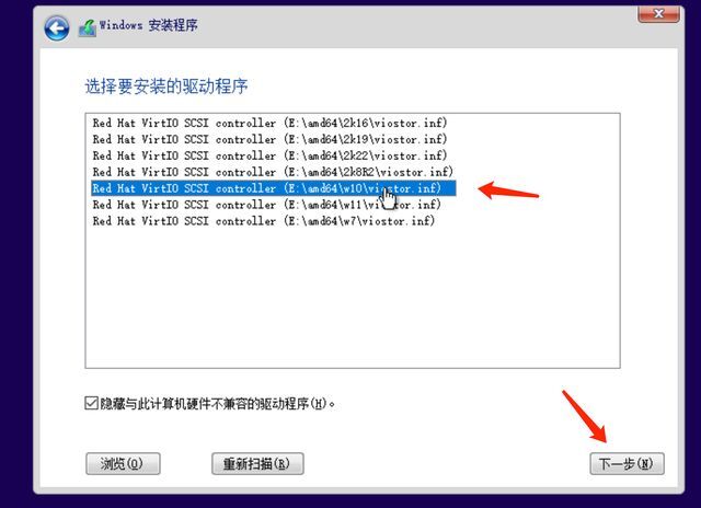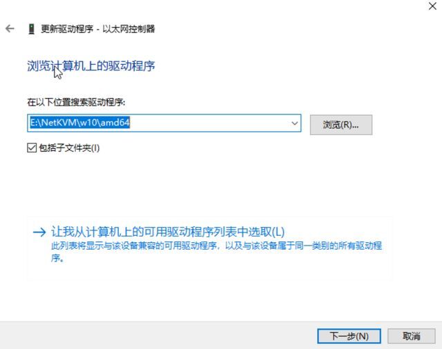 之前已经加载了虚拟驱动,在 NetKVM\w10\amd64,因为我的是 WIN10 64 位镜像。