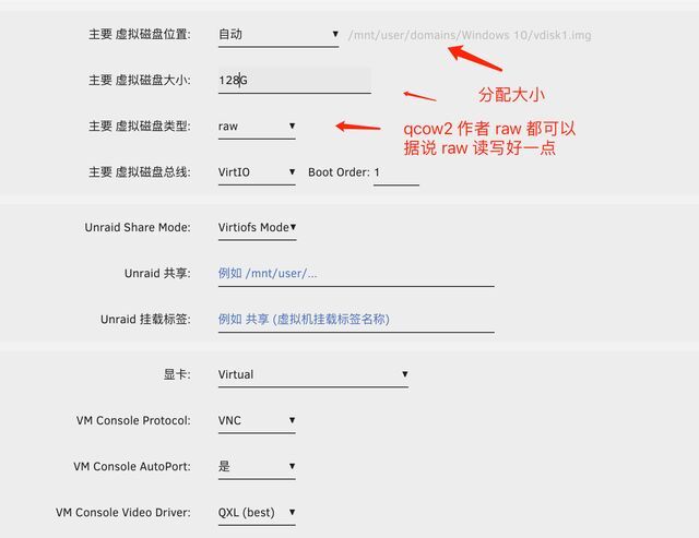 主要磁盘位置选自动,虚拟磁盘就 128G,类型选择 raw,一次性分配 128G 大小,后面的都默认了,创建虚拟机后进入 VNC 查看显示画面。