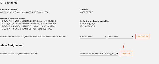 重新打开插件,可以看到核显可以选择了,选择一个虚拟机就是 WIN10,前面的模式选择第一个,点击 ASSGUB VM 添加。注意核显之前不要在系统设备里 VFIO 直通了,不然会失败。